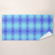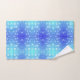A set of vibrant blue and turquoise towels with a white polka dot pattern on a rack, conveying a fresh, calming tone. Includes large towel, hand towel, and washcloth.