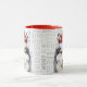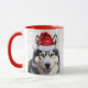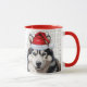The mug has a design of a cute Siberian Husky wearing a Santa hat. The background of the mug is covered in a repeating pattern of the words "woof". The image is bright and cheerful, and it would be perfect for a Christmas-themed gift.
