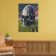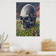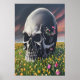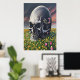 A skull is laying on a field of a lot of yellow flower and some pink flower with dark sky above. This is a AI generated art.