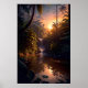 Discover a charming faraway jungle, where a small waterfall cascades gently amidst lush flora, all basked in the warm embrace of the setting sun. Nature's beauty flourishes in this enchanting scene, inviting you to explore the secrets of the jungle. Immerse yourself in the captivating allure of this picturesque digital art, where the wonders of the wilderness come to life.