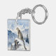 A pretty wildlife Keychain with an illustration of a majestic snow leopard perched on a craggy, snow-covered peak, gazing out at a vast, frozen mountain range.