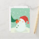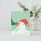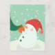 A snowman hanging an ornament on a tree postcard