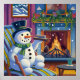 A snowman sits on a chair by the fireplace on Christmas Eve
