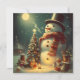 This image shows a smiling snowman wearing a black top and a red and white scarf. It is surrounded by gifts and an illuminated Christmas tree. Behind him, you can see a house and trees covered in snow. The sky is dark and starry, with a full moon shining. This vintage image evokes the magic and joy of Christmas.