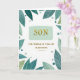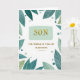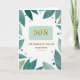 This greeting card centers on the large word “SON” in glowing gold letters, set inside a pale mint-green rectangle with a lightly textured look. Just beneath it, the line “THE WORLD IS FULL OF BLESSINGS” appears in smaller, warm muted-brown text, neatly aligned under the main word. The text sits on a wide white background, giving the layout plenty of breathing room and an intimate, close-to-the-heart feel. Around the wording, a leafy border curls in from all sides, with cool greens and blue-greens shifting from deep teal to aqua and soft sage, like a quiet garden scene 🌷. Fine vein-like lines run through each leaf, and the overlapping shapes create a gentle sense of closeness, as if the foliage is leaning in to frame the message. Small round dots in matching blue-green and light green are sprinkled between leaves, like dew drops catching light, adding a soft sparkle 🐇. The leaf border forms an organic frame with varied angles, and the pale mint rectangle remains centered against the bright white field.