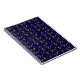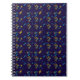 A spiral notebook with a dark blue cover featuring a repeating geometric pattern. The design includes colorful diagonal lines and abstract shapes. The mood is modern and vibrant.