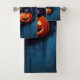 A spooky Halloween scene featuring a skeleton witch. Her bony body is adorned with a tattered black cape and a pointy witch's hat that flutters in the wind. Placed around her are bright pumpkins of various sizes, whose carved faces look cheerful and scary at the same time. Some pumpkins emit a warm, orange light. The colour palette consists of dark tones such as black and blue, combined with bright accents of orange