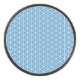 Look closely at this turquoise and blue image and you will see bright stars at the centre of each repeating pattern. You will also see circles. But look at it from a distance and you will see diamond and hexagon shapes. Created using fractals.