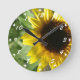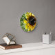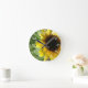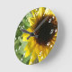 A bright photograph, this sunflower print features a bright yellow sunflower with a large, rich brown centre off-centre against a pale green foliage.