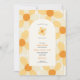 A sweet little daisy girl baby shower invitation features an arch frame with hand drawn design featuring big, bold daisies with a fun, rainbow rain sprinkle in the background.