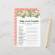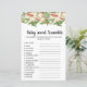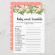 a sweet peach theme features a cute peach braches, scramble word card for baby shower The words on this card are all related to babies and have been scrambled. The guests will compete to see who can unscramble them all first! ANSWER KEY: 1. car seat; 2. milk 3. playpen 4. pacifier The fifth item is a diaper rocking chair. 7. nursery 8. baby monitor; 9. swaddle 10. formula. 11. rubber ducky 12. stroller. 13. monitor. 14. teether. 15. Thermometer.