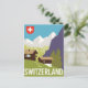This design features a retro travel poster style scene of the Swiss Alps complete with chalets and snowy mountain peaks.