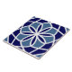 A symmetrical pattern displays interlocking blue geometric shapes with a central floral motif. The design features contrasting shades of blue and white outlines, creating a harmonious and intricate appearance.