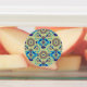 A mesmerising interplay of blue and orange motifs, complemented by subtle accents of yellow and brown, defines this asymmetrical textile design. The careful arrangement of colours creates a sense of balance and harmony, making it a captivating addition to any room.