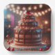 A decadent three-tiered chocolate cake takes centre stage, its rich layers adorned with cascading chocolate ganache and a vibrant scattering of colourful sprinkles. Each tier is crowned with plump, juicy cherries, and a single, perfect cherry reigns supreme at the very top. The warm, inviting glow of fairy lights in the background creates a festive atmosphere, hinting at a joyous celebration. The scene is a feast for the eyes, promising a delightful explosion of flavour with every bite.
