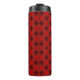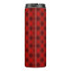 A tall travel mug with a vibrant red plaid pattern, featuring diagonal black and dark red lines. It has a sleek black lid, conveying a modern design.