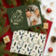 A modern dark green and gold foil religious holiday card. On the reverse is a pattern of green and navy holly and pine leaves. Personalise with your favourite photo and sign off.