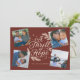 A modern religious Holiday Card with the phrase "A Thrill of Hope" in the centre on a dark red background, surrounded by 4 of your favourite photos. On the reverse is a pattern of green and navy holly and pine leaves on a cream background.
