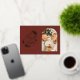 A modern red and gold foil religious arch photo holiday card with "A Thrill of Hope" in hand lettering style font . On the reverse is a pattern of green and navy holly and pine leaves.