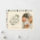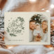 A modern Religious Arch Photo Holiday Card with A Thrill of Hope in whimsical lettering in dark green. On the reverse is a pattern of green and navy holly and pine leaves.
