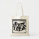 A cream-coloured tote bag with some calligraphy-styled black letters on it's front size and six-letters on back-side of bag