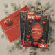 A touch of gothic, hearts and eternal connection. The design features a dark, elegant background design that immediately draws attention. Several bright red hearts, some seemingly turned into teardrops, hang from delicate, thin strings, lending the card a playful and romantic touch. The centre is dominated by an artfully designed frame with a red interior, decorated with a delicate rose pattern symbolising love and passion. At the bottom, lush bouquets of red roses with lush greenery adorn the card, underscoring the romantic atmosphere.