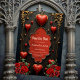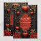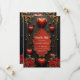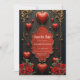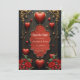 A touch of gothic, hearts and eternal connection. The design features a dark, elegant background design that immediately draws attention. Several bright red hearts, some seemingly turned into teardrops, hang from delicate, thin strings, lending the card a playful and romantic touch. The centre is dominated by an artfully designed frame with a red interior, decorated with a delicate rose pattern symbolising love and passion. At the bottom, lush bouquets of red roses with lush greenery adorn the card, underscoring the romantic atmosphere.