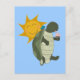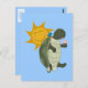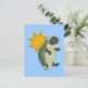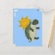 A turtle enjoys an ice cream cone on a warm day in the mixed media image on this postcard. The green tortoise sits upright with legs outstretched. He holds a waffle cone filled with ice cream covered in colourful sprinkles. The smile on his face as he licks the frozen treat shows his satisfaction. A blue butterfly has lit on his shell and a smiling sun shines down on both of them. From my original digitally created image.