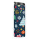 This image is a vibrant and cheerful pattern featuring a delightful array of Christmas-themed illustrations. Set against a dark blue background, the pattern showcases colourful Christmas trees adorned with lights and ornaments, various baubles in different shapes and sizes, candy canes, snowflakes, presents, and festive decorations. The hand-drawn style of the illustrations adds a playful and whimsical touch to the overall design.