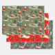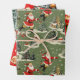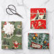 These three wrapping papers share a cohesive, vintage Christmas aesthetic, utilizing a classic color palette of deep reds, greens, cream, and touches of gold. The first design uses a soft, sage-green background with a wintry village scene, showcasing repeating images of a running Santa Claus, snow-covered houses, and evergreen trees The second design features an energetic, repeating pattern of retro-style elves dancing on a snowy landscape against a bright red background scattered with stars. The final design is a dense, repeating pattern of Christmas tree branches covered in snow or flocking, richly decorated with traditional red, green, and gold glass ornaments, and interspersed with "Merry Christmas" labels framed in red.