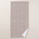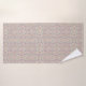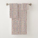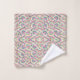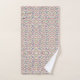 A vibrant, colourful towel hangs on a rod, featuring a psychedelic pattern of swirling shapes in pink, blue, green, and yellow. The design is lively and intricate.