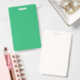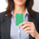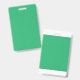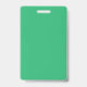 A vibrant green leaf with prominent veins and a de ID badge