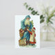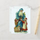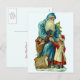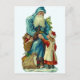This Vintage Christmas postcard features Santa Claus dressed in blue carrying gifts for a small girl.