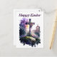 A colourful watercolor Easter Greeting Card with a cross on a hill, surrounded by flowers and a tree and a church in the background.