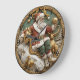 Santa Claus sits comfortably on a lavish throne adorned with festive decorations, surrounded by gentle deer. Snow-covered trees create a perfect winter backdrop as he holds a shimmering ornament in his hand, embodying the spirit of Christmas joy and giving.