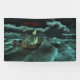 A 3D seascape created in Vue, depicting a small sailing ship with red flags on a storm-tossed sea. The billows are lit with an eerie blue-green light, and the dark clouds above threaten further danger to the ship.