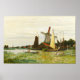 A Windmill at Zaandam. Claude Monet. Landscape in warm colors. There are boats and a yacht on the river near the shore. On the opposite bank there is a tall mill and a small house under a red roof. There are light clouds in the sky. Reproduction of famous works of art images in the public domain.