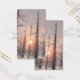 A pale winter sun sets behind towering larch trees like dark sentinels. Their gnarled branches, bare except for a dusting of snow, and the pastel golds, pinks, and blues of the sunset sky are seen as through a dreamy haze. In the foreground snowflakes are softly falling.