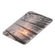 A pale winter sun sets behind towering larch trees like dark sentinels. Their gnarled branches, bare except for a dusting of snow, and the pastel golds, pinks, and blues of the sunset sky are seen as through a dreamy haze. In the foreground snowflakes are softly falling.