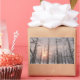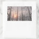 A pale winter sun sets behind towering larch trees like dark sentinels. Their gnarled branches, bare except for a dusting of snow, and the pastel golds, pinks, and blues of the sunset sky are seen as through a dreamy haze. In the foreground snowflakes are softly falling.