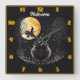A whimsical witch hovers on her broomstick above a bubbling cauldron, illuminated by a glowing full moon, surrounded by trees and twinkling stars.