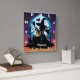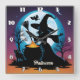 A mysterious witch stirs a bubbling cauldron as her black cat watches, all framed by a glowing full moon and a backdrop of spooky trees at twilight.