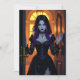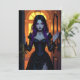 Witch themed Halloween party invitations with ai art depicting a. beautiful witch in black and purple holding a door open saying come in if you dare! A Halloween party is brewing! Funny witch pun.