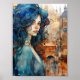 AI generated beautiful woman with blue hair in the city in a mixed media alcohol inks and watercolor style of art