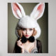 A woman wearing a rabbit hat and a black bow tie poster