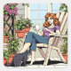 A Women with Coffee, Cat and Plants Square Sticker