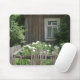 A mousepad showing a wooden rural hut with a window and a garden full of white roses.