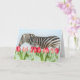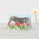 A digital painting of a zebra walking through some pink and red tulips on a sunny day.