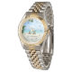 The watch is very nice, the picture is great and the watch looks like quality. The only problem I am having with it is that it is a little too large, and I also can't figure out how to open the clasp. No directions came with it. Very good. The printing is perfect and the watch keeps good time.