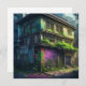 Post apocalyptic abandoned building with purple and green graffiti and plant over growth. Urban decay, lost spaces ai art.